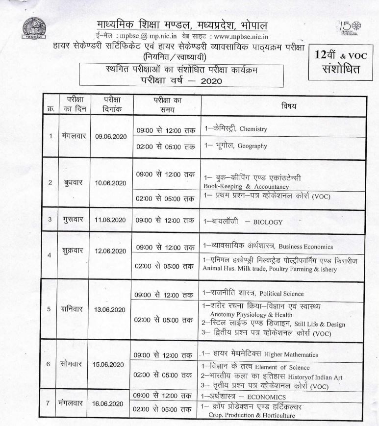 मध्यप्रदेश माध्यमिक शिक्षा मंडल द्वारा हायर सेकंडरी और हायर सेकंडरी व्यवसायिक परीक्षा-2020 की शेष विषयों की परीक्षाओं का कार्यक्रम जारी कर दिया है। परीक्षार्थी को थर्मल स्कैनिंग होने के कारण परीक्षा केंद्र पर एक घंटे पूर्व उपस्थित होना पड़ेगा।